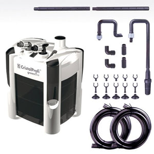Contenuto: JBL CristalProfi E greenline, filtro esterno per acquari con tubi flessibili, tubi, cestello aspirazione, gomito, ventose, masse filtranti (sfere e spugne filtranti)