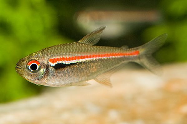 Conosciuto anche come red line tetra, specie endemica del Brasile