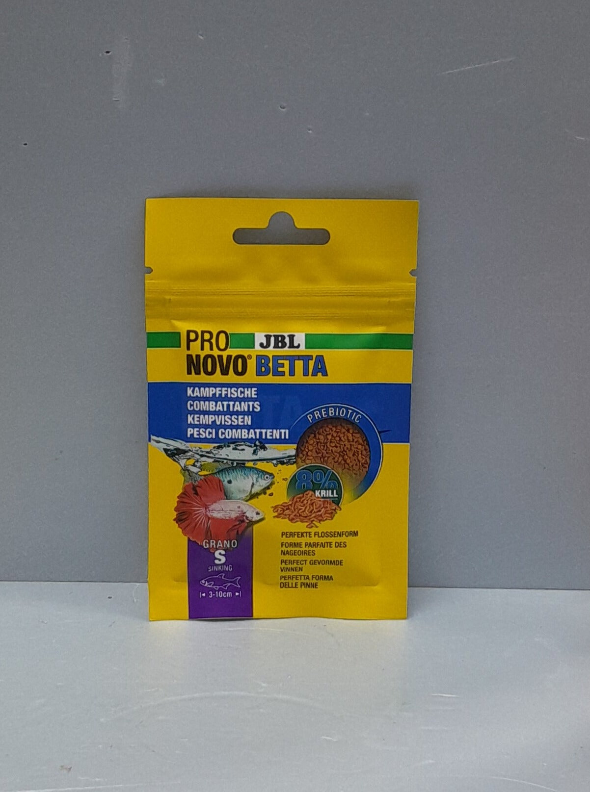 Pro novo bel betta è un mangime semi-galleggiante adatto ai betta splendens e a tutte le specie di pesci ornamentali. Altamente gradito e appetibile contiene l'8% di farina di krill.