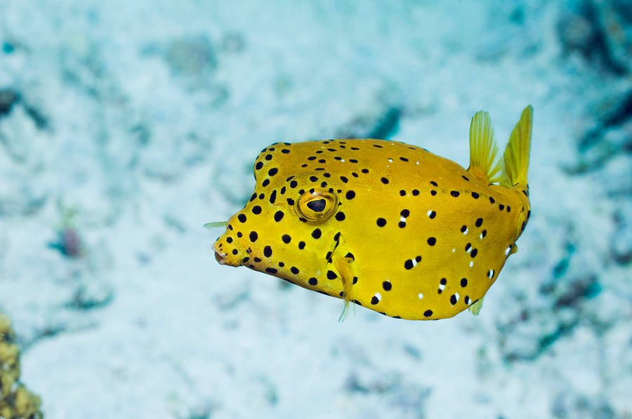 Pesce scatola. E’ amato per il suo colore giallo. E’ però importante sottolineare che solo gli esemplari più piccoli presentano un corpo giallo a pois. Il pesce scatola Ostracion cubicus, una volta adulto, assume una colorazione diversa: il giallo vira verso l’ocra-arancio o ocra-verdognolo. Gli esemplari più giovani possono presentare pois blu o pois neri, mentre nell’adulto si tratta di macchie scure più diradate e meno definite.