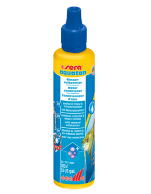 Sera Aquatan, rende l' acqua di rubinetto in acqua idonea per l' uso in acquario eliminando cloro e metalli pesanti dannosi per la vita dei pesci.